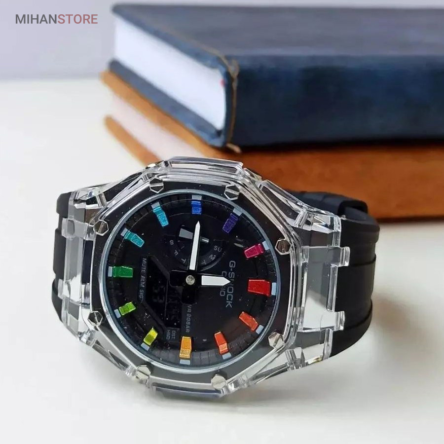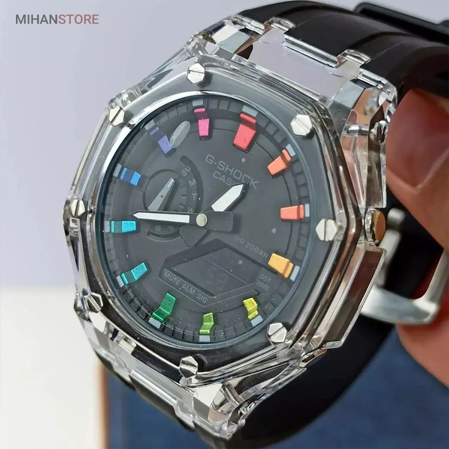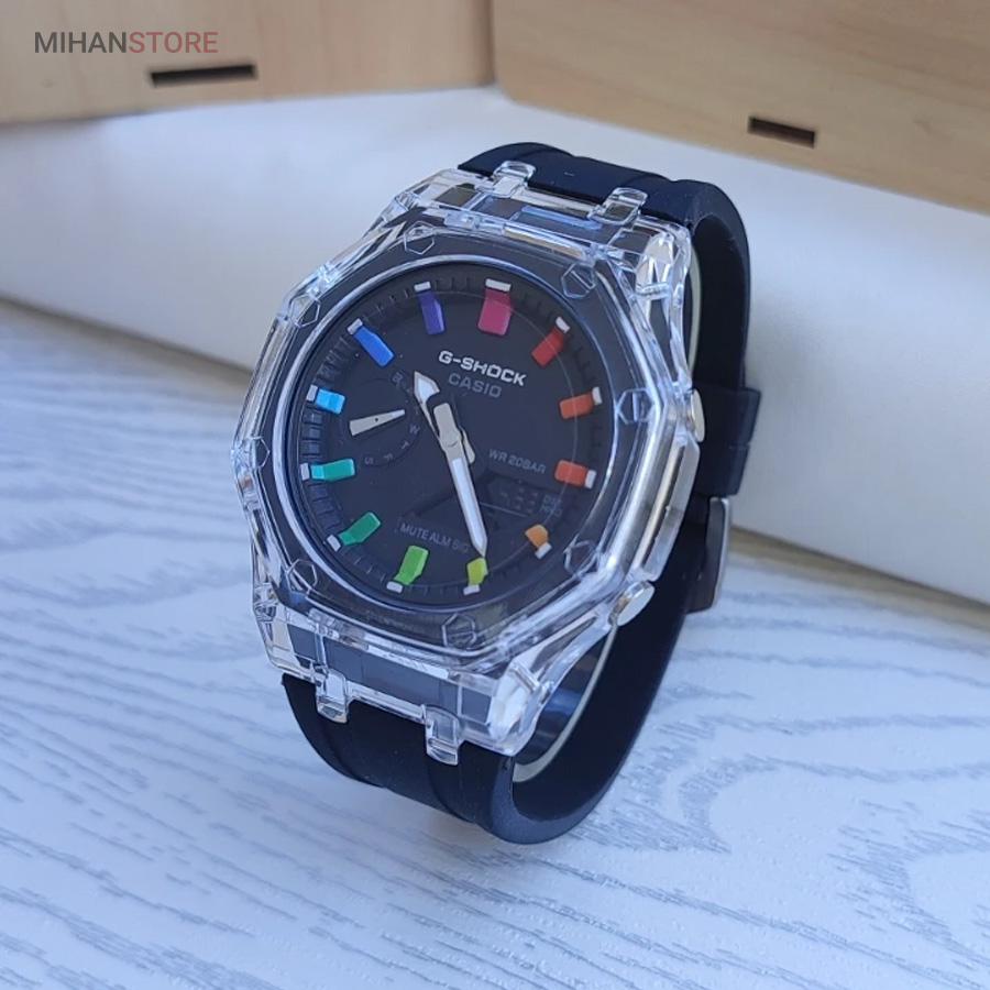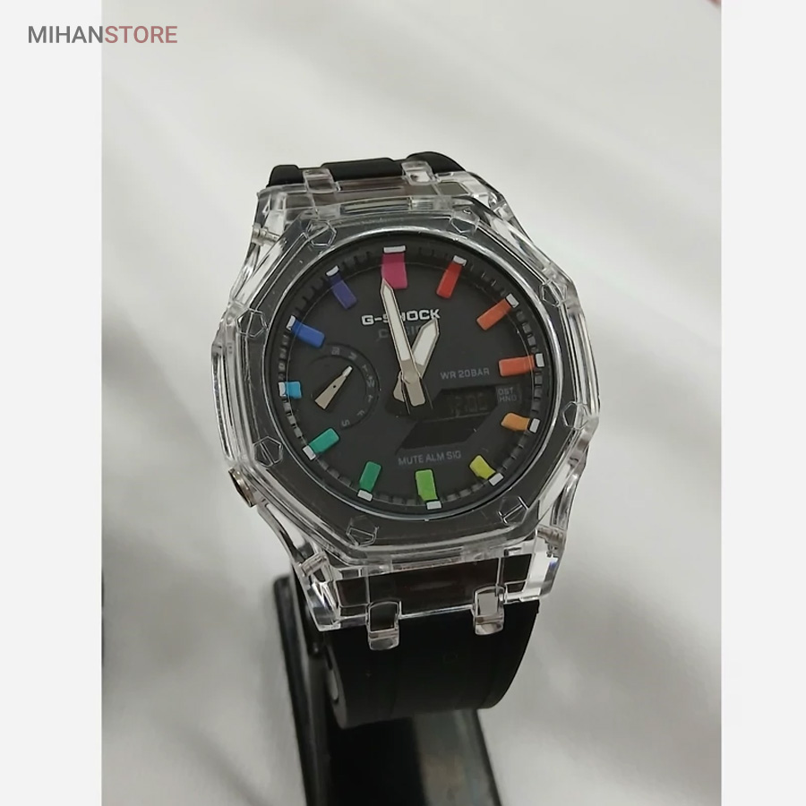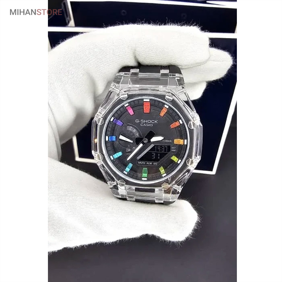 ساعت مچی ضدآب کاسیو جی شاک - GA2100، یک ساعت مدرن و مقاوم است که برای افراد فعال و علاقه‌مند به سبک‌های ماجراجویانه طراحی شده است. این ساعت مچی جی شاک دارای بند رابر مشکی و صفحه مشکی است که به آن ظاهری اسپرت و شیک می‌بخشد. جنس رابر بند، علاوه بر سبک بودن، بسیار مقاوم و ضد ضربه است که آن را برای استفاده روزمره و شرایط سخت مناسب می‌کند. این ساعت دو موتوره می باشد و به صورت های کپی (با کیفیت فوق العاده بالا) تولید شده است و همراه با جعبه ای شکیل عرضه می شود.