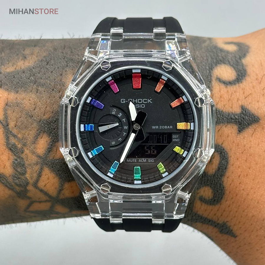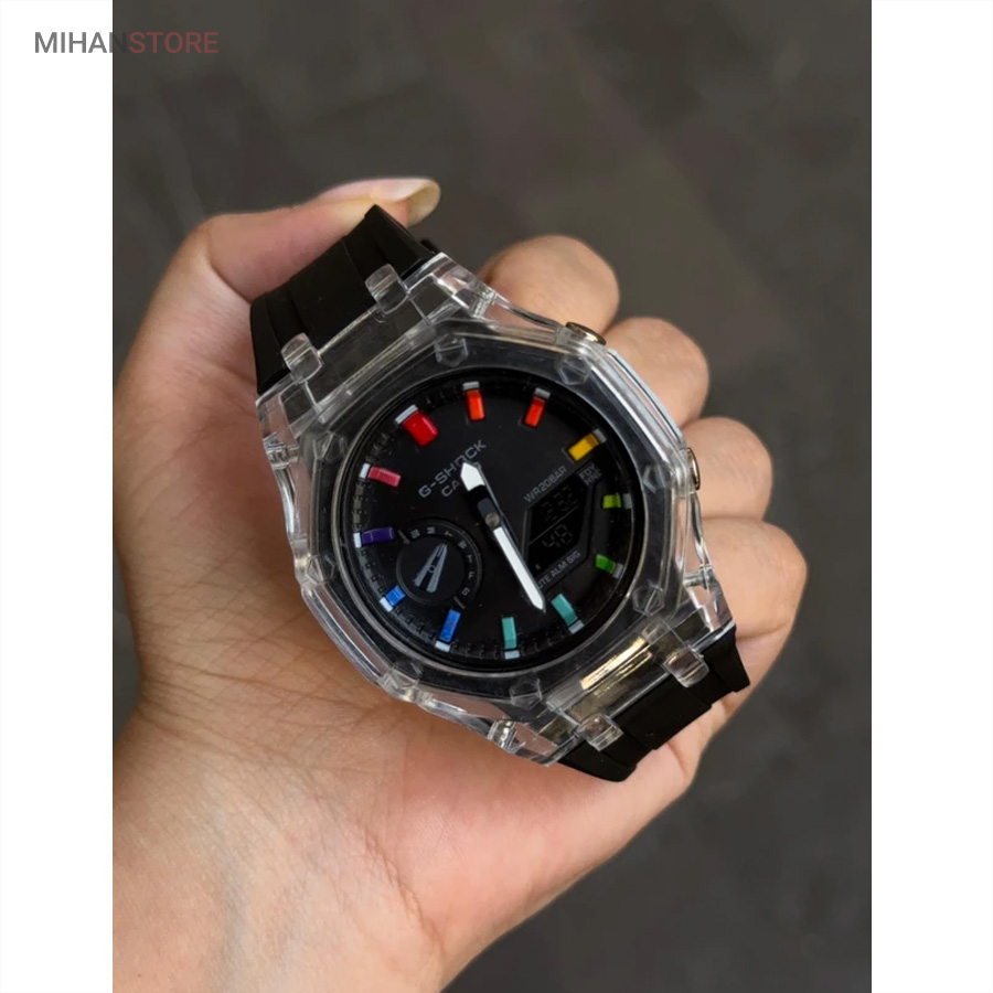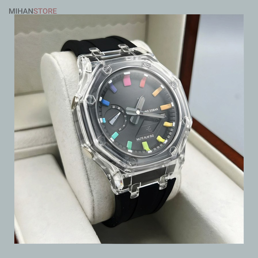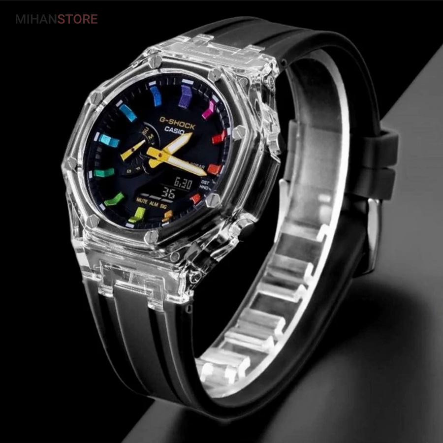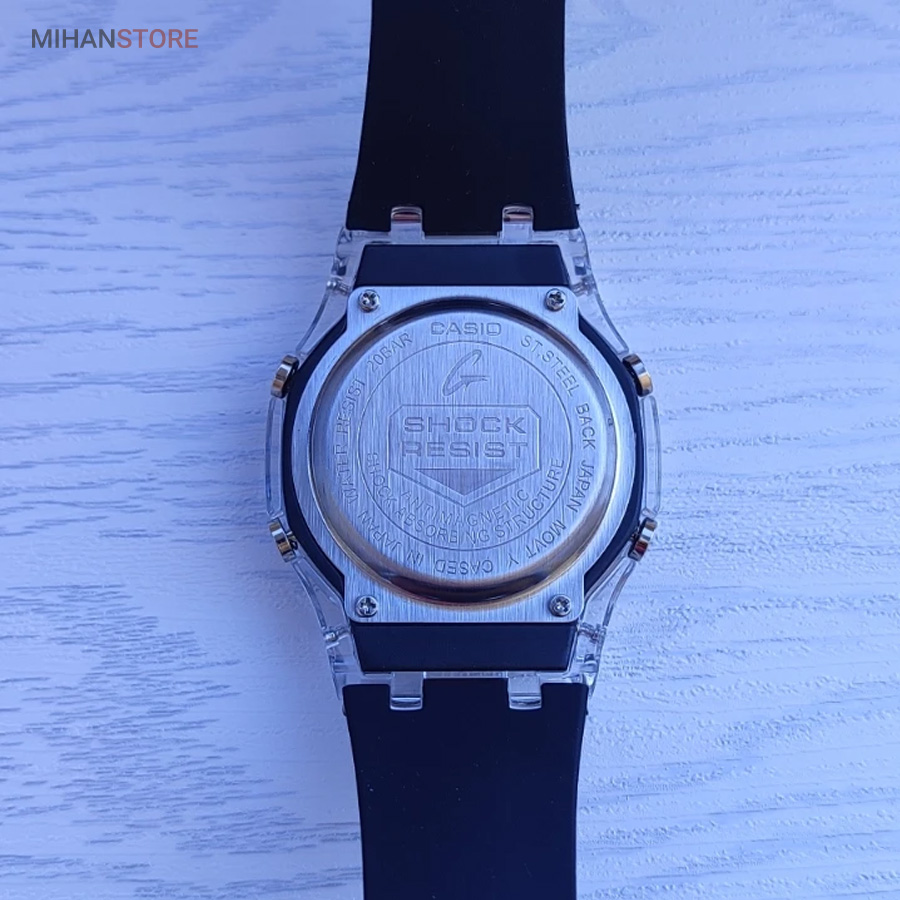 ساعت مچی ضدآب کاسیو جی شاک - GA2100، یک ساعت مدرن و مقاوم است که برای افراد فعال و علاقه‌مند به سبک‌های ماجراجویانه طراحی شده است. این ساعت مچی جی شاک دارای بند رابر مشکی و صفحه مشکی است که به آن ظاهری اسپرت و شیک می‌بخشد. جنس رابر بند، علاوه بر سبک بودن، بسیار مقاوم و ضد ضربه است که آن را برای استفاده روزمره و شرایط سخت مناسب می‌کند. این ساعت دو موتوره می باشد و به صورت های کپی (با کیفیت فوق العاده بالا) تولید شده است و همراه با جعبه ای شکیل عرضه می شود.